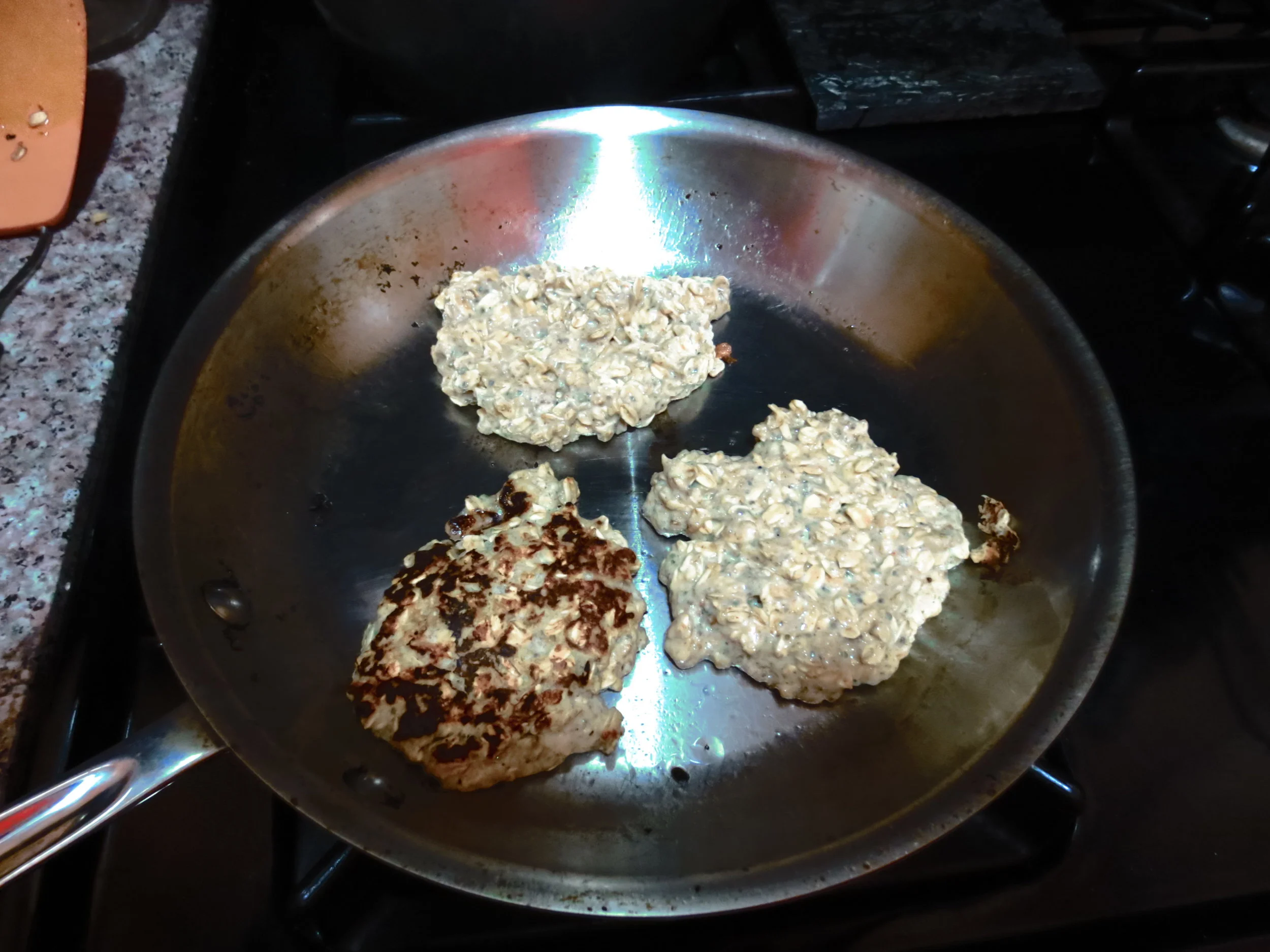 Mix egg oatmeal mixture and almond banana mixture. Mix in any optional add-ins. Wait five minutes for oatmeal to absorb some liquid. Cook pancakes in coconut oil in a frying pan. Wait until pancakes bubble before flipping. Pancakes will keep well for a few days. Store in the refrigerator.